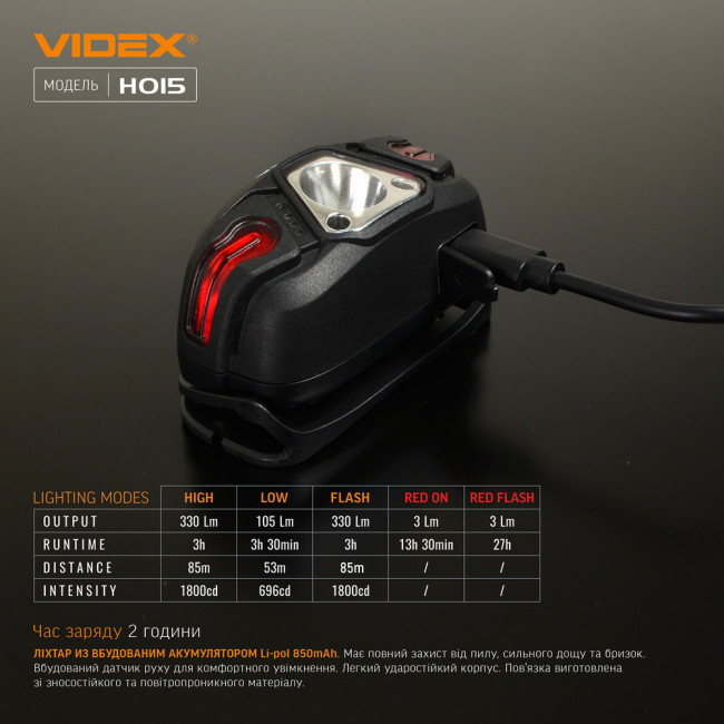 Характеристики Ліхтарик налобний акумуляторний VIDEX VLF-H015 330Lm, USB-C, Li-Pol 850mAh, IP67, сенсор, червоне світло