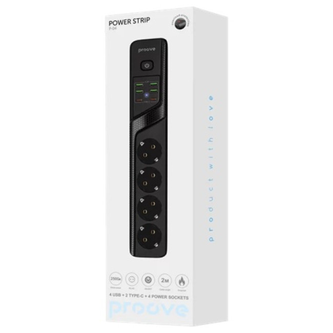 Опис Мережевий фільтр Proove P-04 (4 розетки + 4 USB + 2 Type-C) 2 м, чорний, вогнестійкий пластик, швидка зарядка