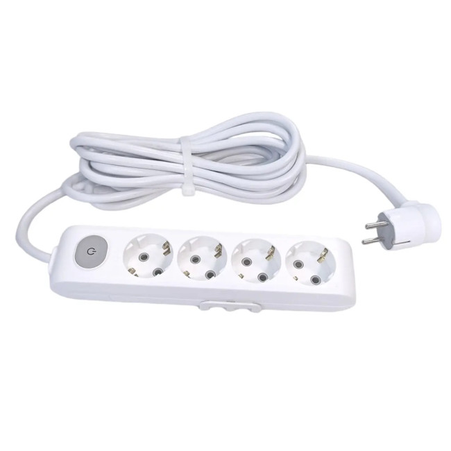 Опис Подовжувач білий із заземленням та вимикачем 16А (3,5 кВт), 4 розетки, довжина 2 метри, IP20