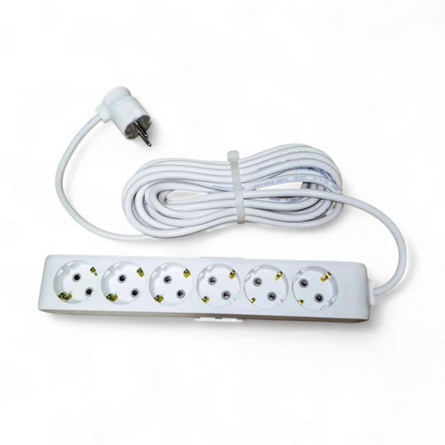 Подовжувач із заземленням 16А (3,5 кВт), 6 розеток, довжина 5 метрів, IP20, білий (Код товару 6945)
