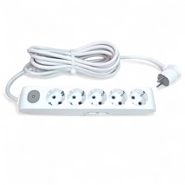 Опис Подовжувач із заземленням і вимикачем 16А (3,5 кВт), 5 розеток, довжина 3 метри, IP20, з тримачем, білий