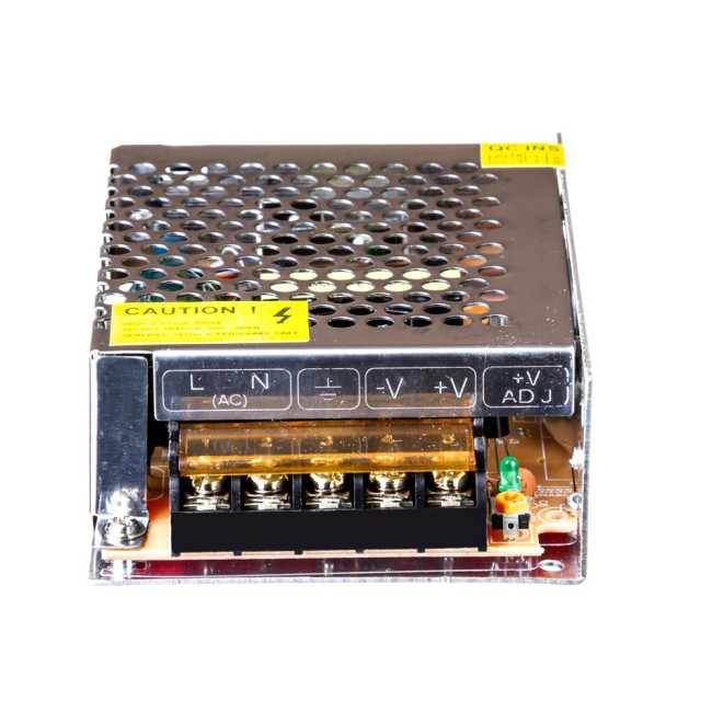 Корпус выполнен из прочного металла с вентиляционными отверстиями, что способствует эффективному отводу тепла без применения вентиляторов. Компактные размеры 115×77×37 мм позволяют удобно размещать блок внутри распределительных коробок, мебели, щитков или под декоративными элементами.