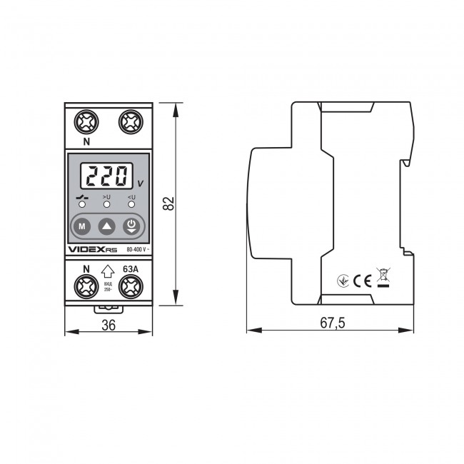 Описание Реле контроля напряжения однофазное VIDEX RESIST 145–300В 63А – реле защиты 2-полюсное, DIN, IP40